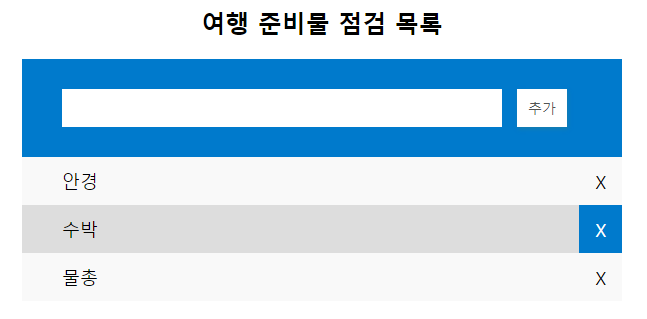 아까 X버튼을 정의하면서 그 부분의 id값을 i로 지정해두었으므로, id값은 삭제해야 하는 요소의 index를 뜻한다.