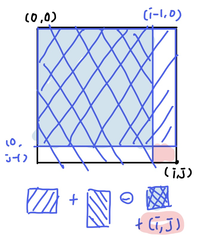 arrr[1025][1025]와 dp[1025][1025] 두 배열을 선언하고 (global), 이 배열에 대해 arr에는 입력되는 배열의 값을, dp[i][j]에는 (i, j)까지의 사각형 안 모든 숫자의 합을 저장하였다.