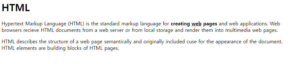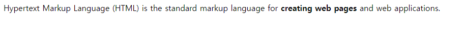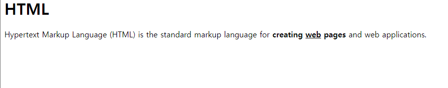 <p>Hypertext Markup Language (HTML) is the standard markup language for <strong>creating <u>web</u> pages</strong> and web applications.