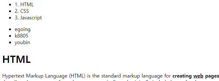 <li> 태그의 부모에 해당하는 <ui> 태그를 사용하면, 두 개 이상의 목록이 있을 때 이를 구분할 수 있다. 아래와 같은 코드를 실행시켜 보았다.