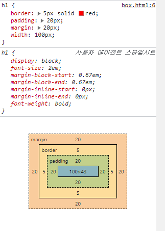 이제 간격을 넓혀 보자. margin을 0으로, padding 값을 20으로 지정한다.