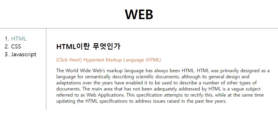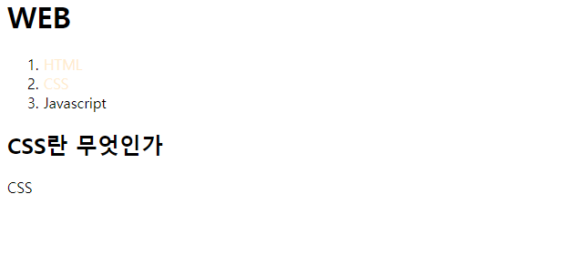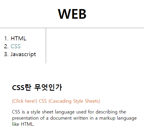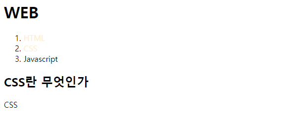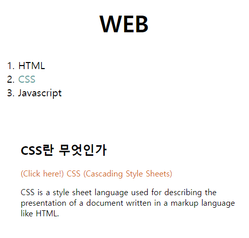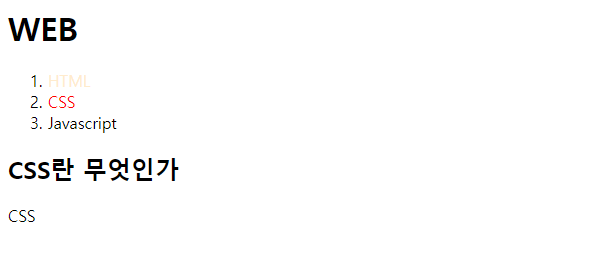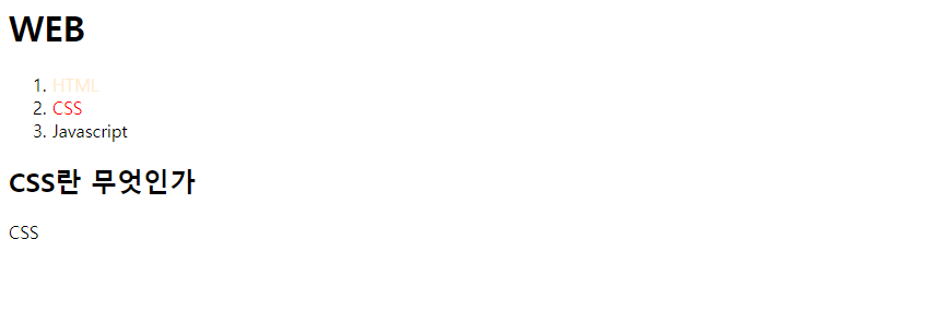 이렇게 코드를 작성하면, CSS라는 글자는 뒤에 있는 class인 active의 성질을 나타내므로 아래와 같이 빨간색으로 글자가 나타나게 된다.