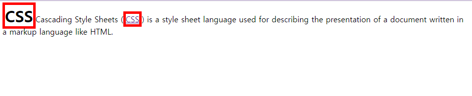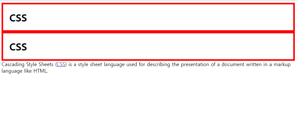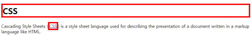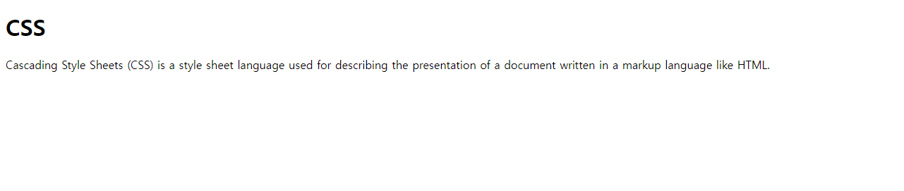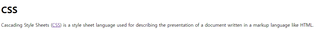 <h1>CSS</h1>Cascading Style Sheets (<a href="https://namu.wiki/w/CSS">CSS</a>) is a style sheet language used for describing the presentation of a document written in a markup language like HTML.